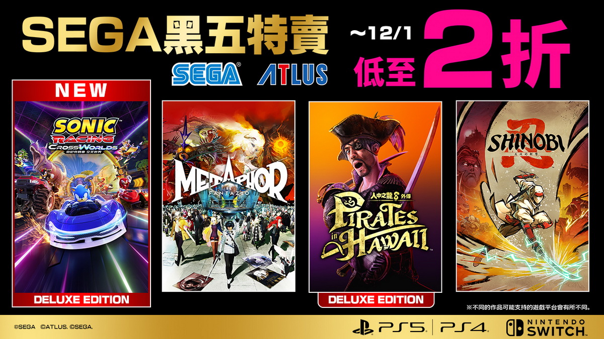 世雅股份有限公司現正舉辦「SEGA黑五特賣」活動。針對PlayStation™Store及Nintendo eShop所販售的部分PlayStation®5/PlayStation®4/Nintendo Switch™遊戲作品奉上限時特價。本次特賣中,不僅有索尼克系列角色,還有眾多人氣合作角色同台競速的《索尼克賽車 交叉世界》數位豪華版將以30%OFF的優惠價格首次登場。