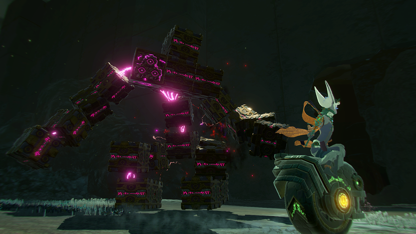 另外,玩家還可以與方塊魔像發動同步攻擊。只要施展強力的迴旋攻擊便能掃蕩敵方並大幅削減強敵的弱點量表。