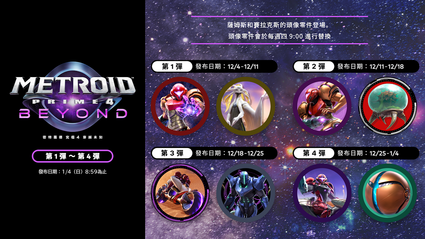 從本日12月4日(四)至2026年1月4日(日)台灣時間 8:59為止,將會以每週更新的方式連續發布四週,請不要錯過這個機會!頭像零件可於Nintendo Switch 2 / Nintendo Switch主機的「Nintendo Switch Online」應用程式上兌換及使用。
