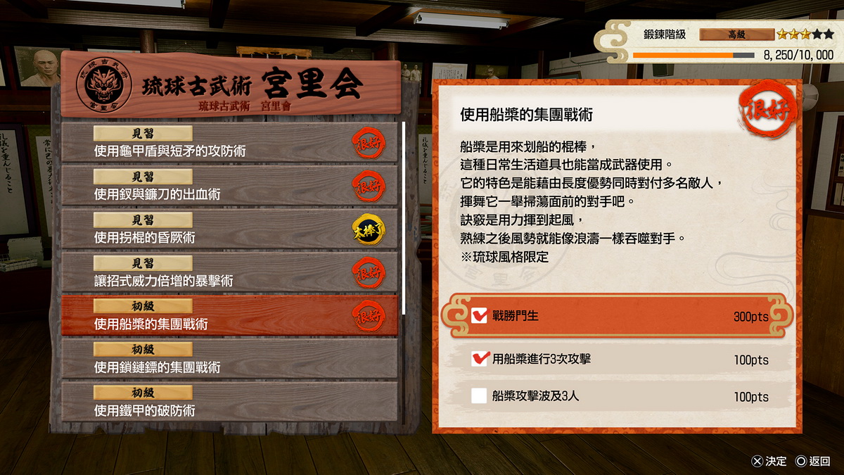 記得積極挑戰訓練與晉級,目標是成為琉球古武術大師!
