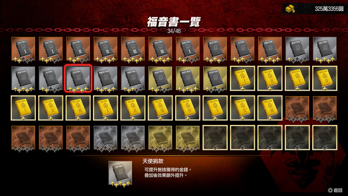 迷宮中藏有許多寶物,只要活著把它們帶回去就能逐步強化峰的能力。寶物有可賦予峰各種能力加成的「福音書」、可讓峰當作攻擊技能使用的「生存武器」,以及付費就能一起作戰的「傭兵」等。