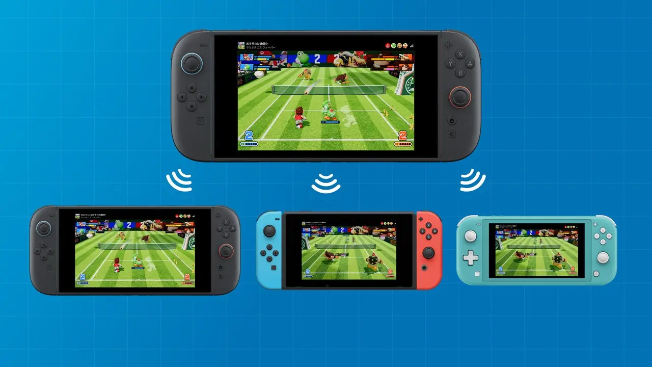 只要有一個遊戲軟體,攜帶主機聚在一起就能分享給附近的人,最多可供4人一同遊玩。除了Nintendo Switch 2之外,Nintendo Switch也同樣能接收軟體。