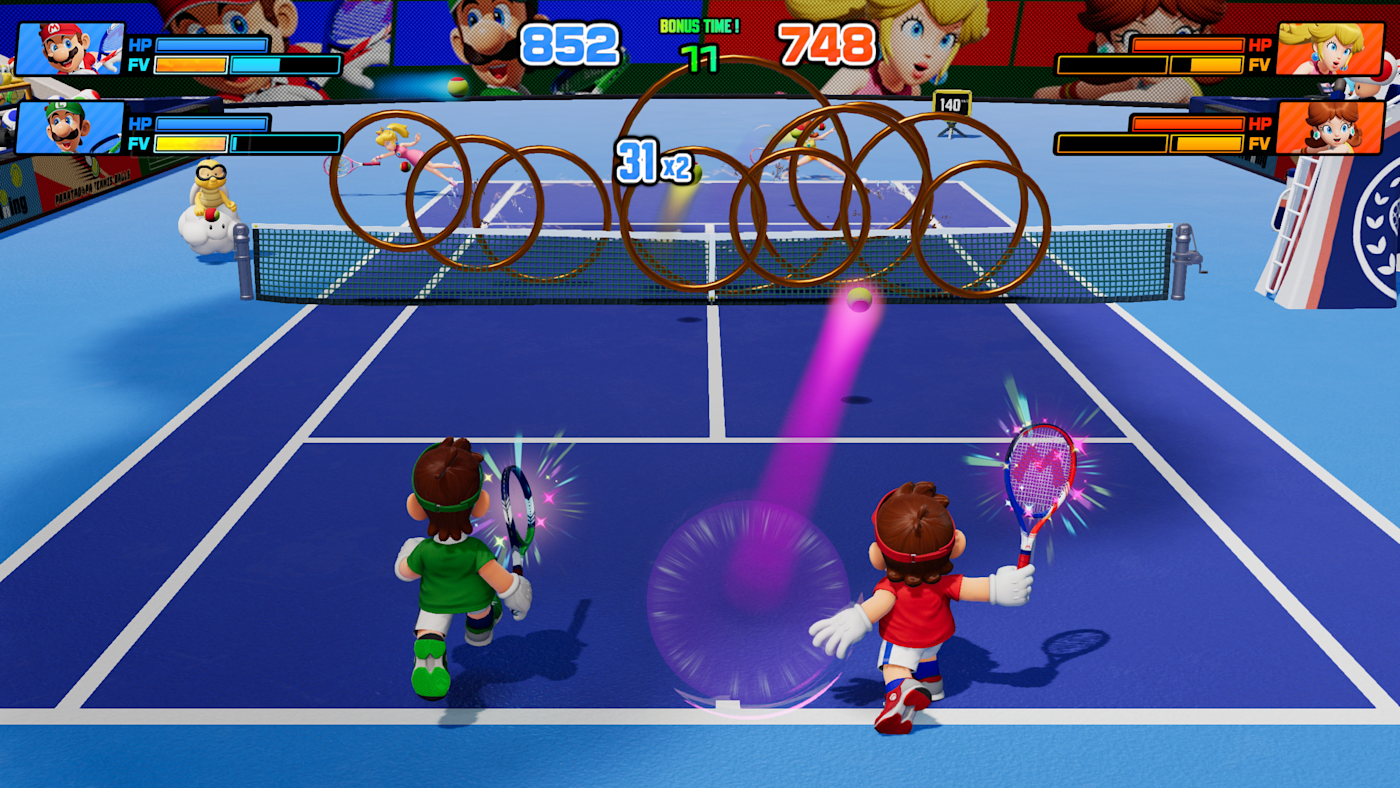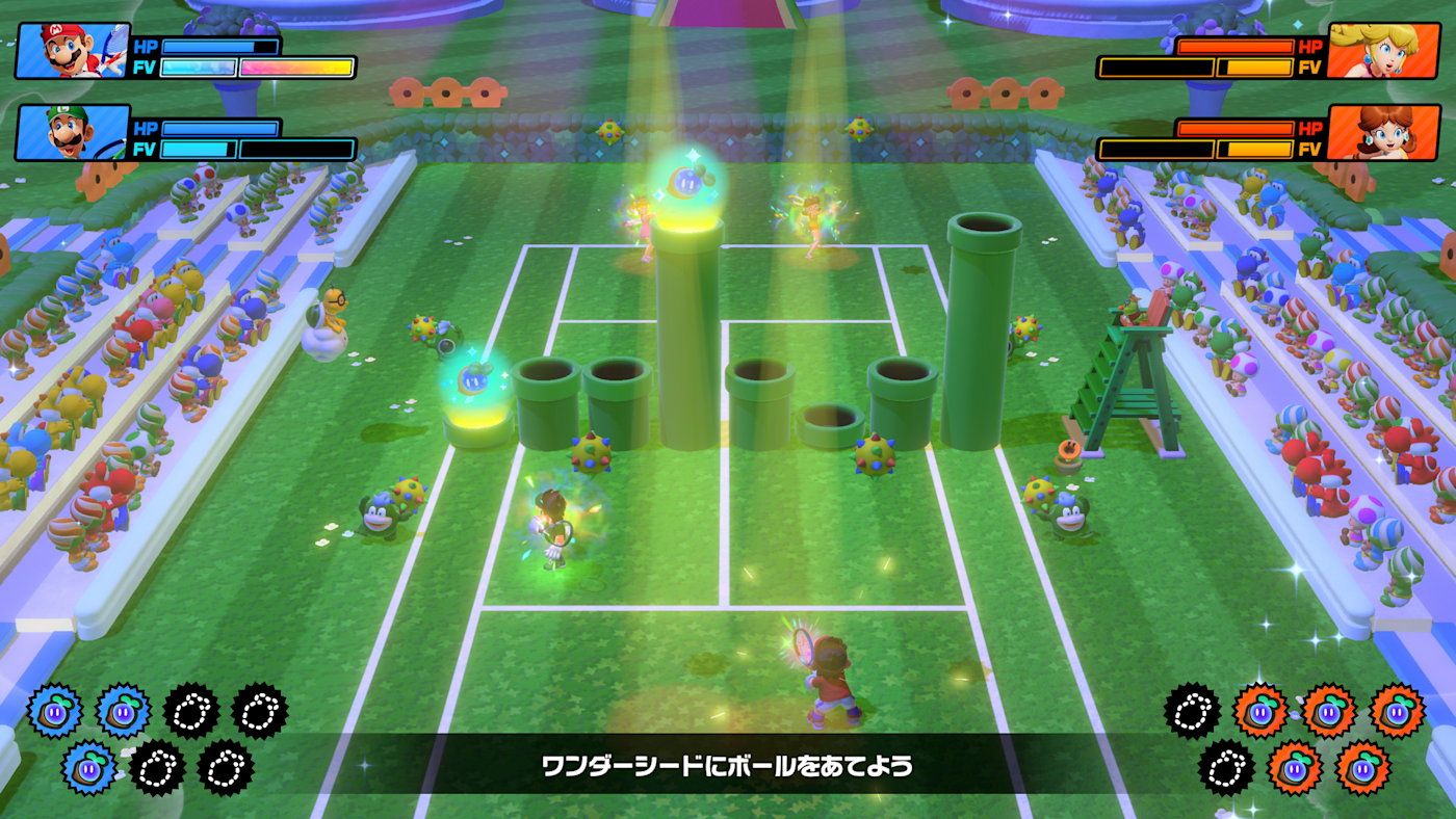 此外,還有可以邊學習網球技巧邊冒險的故事模式。既可享受劇情,也可精進網球技巧,即便是初次遊玩瑪利歐網球的玩家也能安心遊玩。