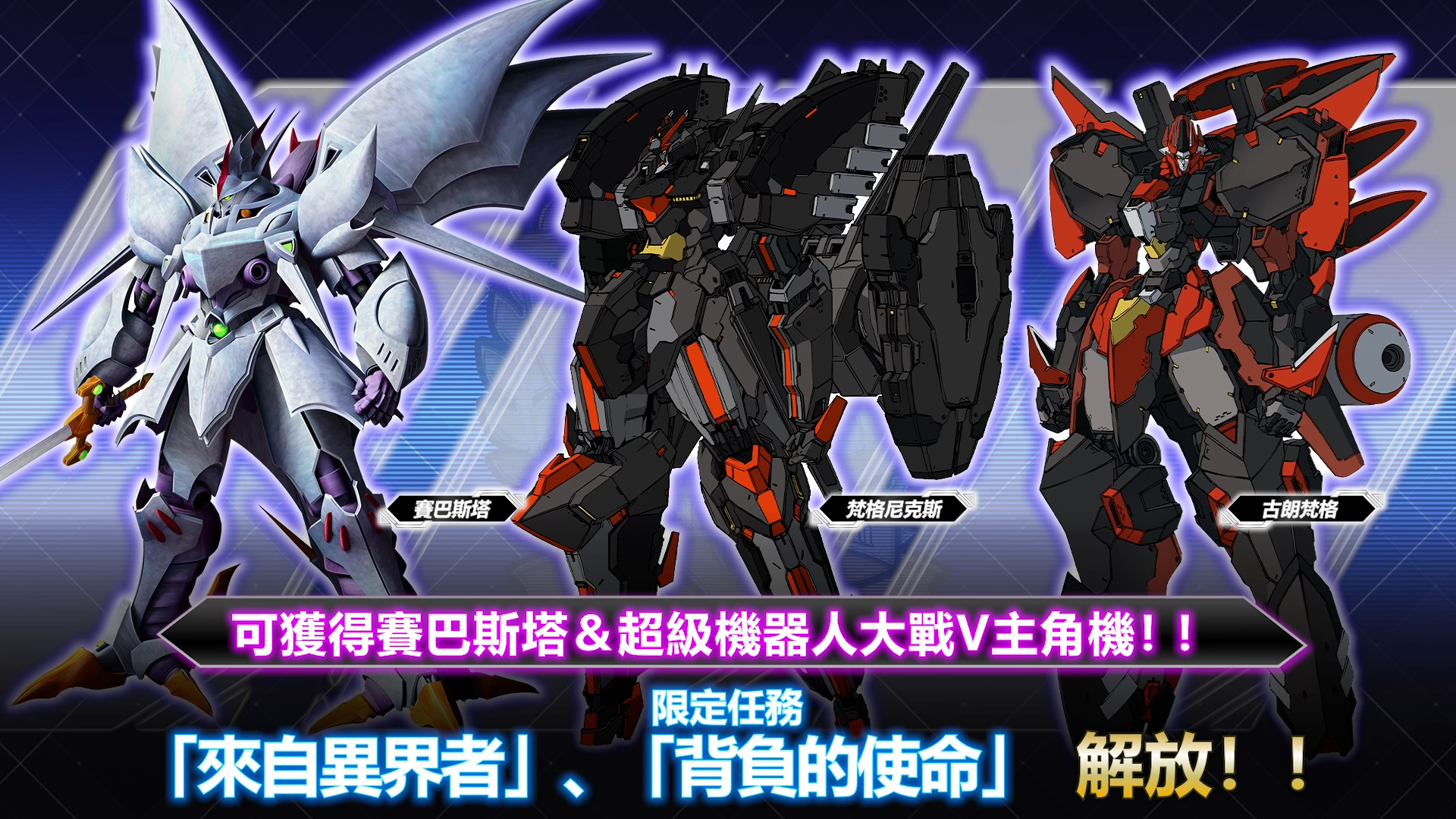 在免費更新ver1.3.0中,將開放可以獲得賽巴斯塔及《超級機器人大戰V》主角機體的限定任務「來自異界者」及「背負的使命」。