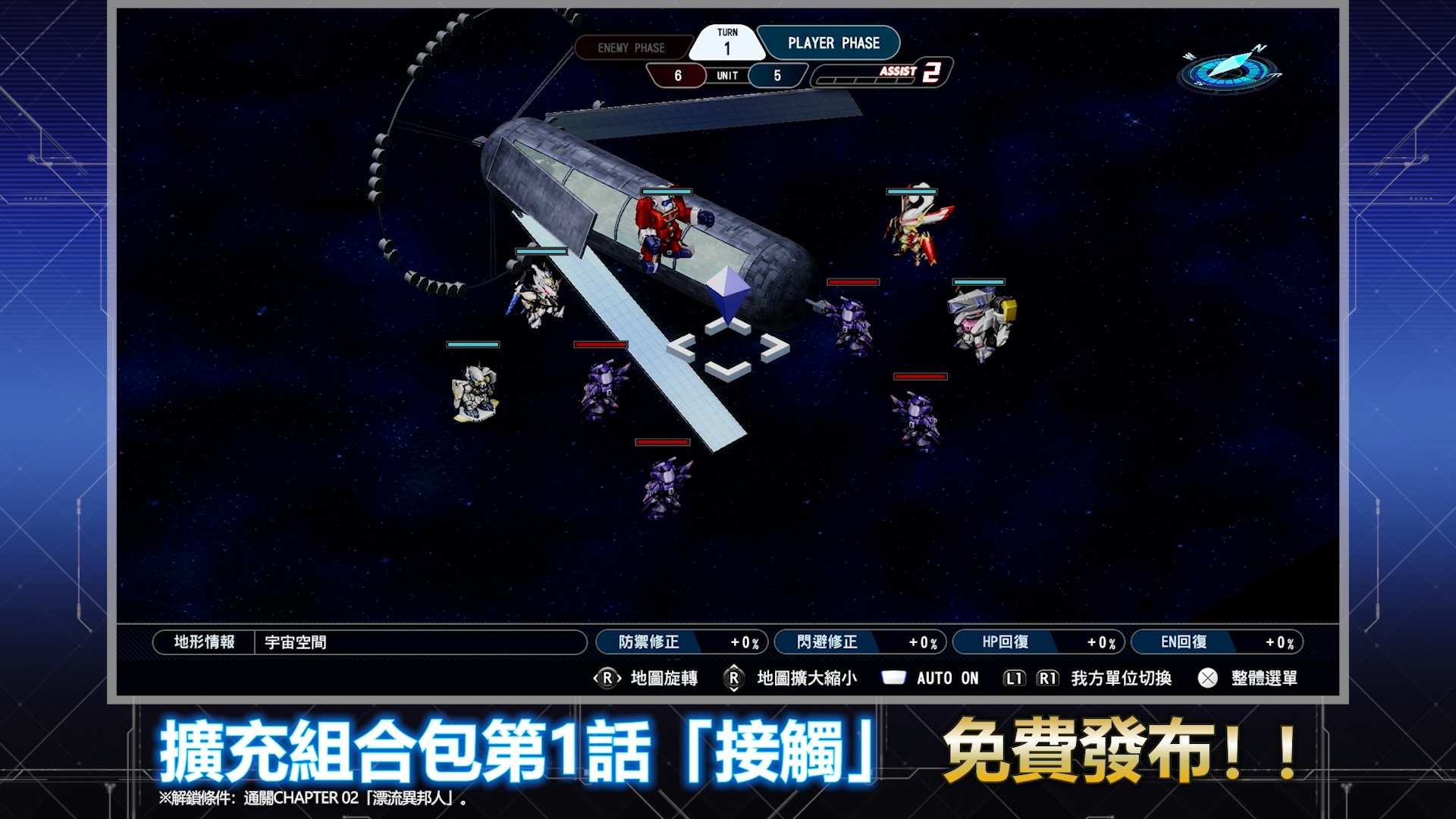 ※將遊戲更新至ver1.3.0後方可遊玩。 ※解鎖條件:通關CHAPTER 02「漂流異邦人」。 ※通關擴充組合包第1話「接觸」時,新機體及駕駛員不會加入己方隊伍。 ※通關擴充組合包第1話「接觸」時,區域任務內新登場的駕駛員不會登錄至「角色百科」中,機體也不會登錄至「機器人大圖鑑」中。
