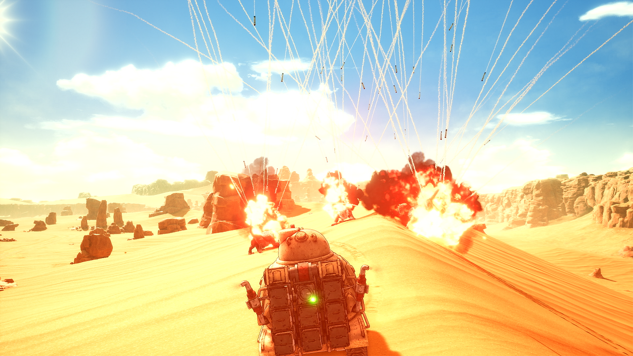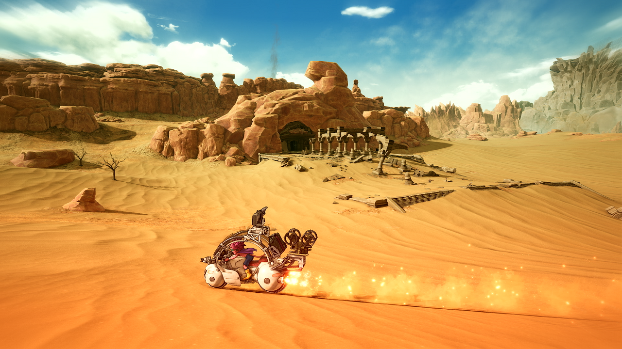 體驗版將自沙漠中的營地開始,探索地圖的各個角落吧。 駕駛機車在廣大的地圖馳騁,或是探索在地圖某處的遺跡,盡情體驗本作的世界。 也有需要駕駛特定機器才能抵達的地方…