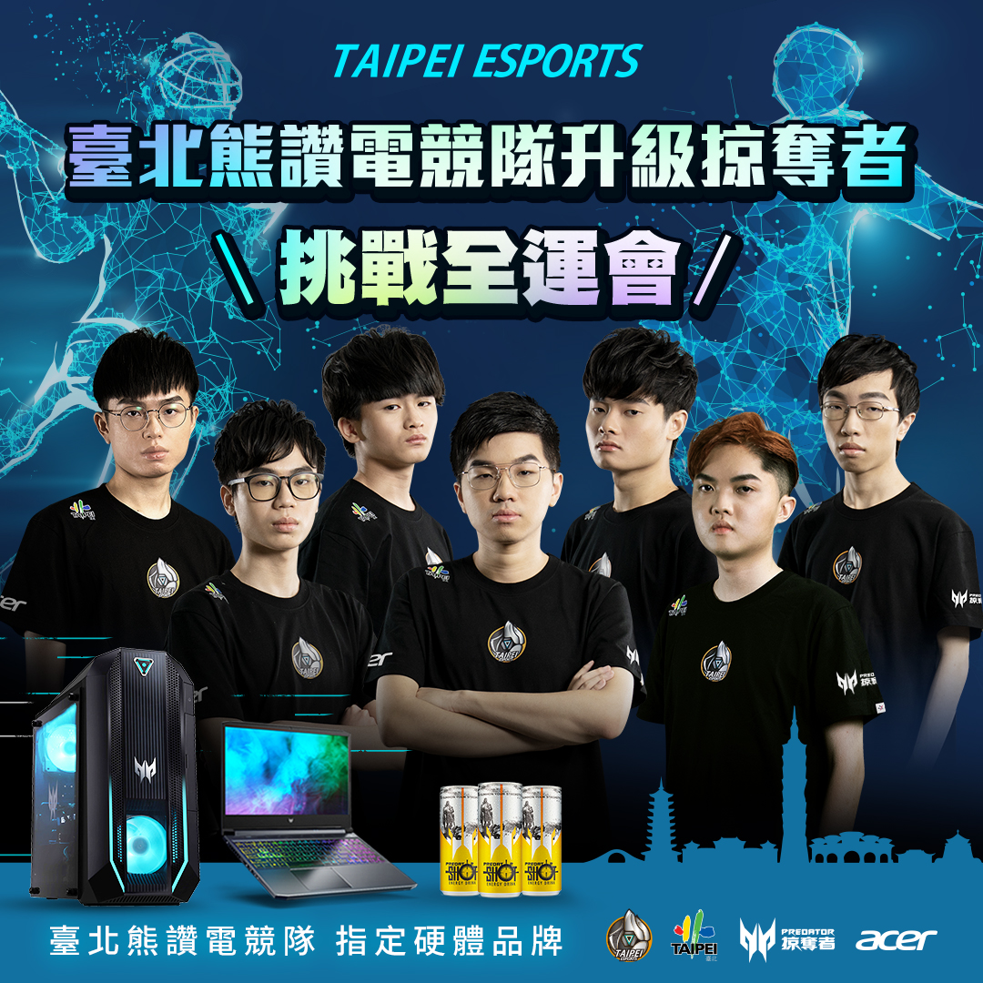 臺北熊讚電競戰隊將代表臺北市參加今年的全國運動會電競項目,與其他縣市的代表隊爭奪國內最高層級的電競榮耀。今年是電子競技運動首次成為全國運項目,因此電競項目的賽事也格外受到圈內及圈外人的矚目。臺北熊讚電競戰隊積極備戰,加上Predator掠奪者的電競等級硬體相助,相信定能夠幫助臺北熊讚隊成為真正的掠奪者,在全國運賽場上大殺四方、戰無不克!展現掠奪者的壓制實力!
