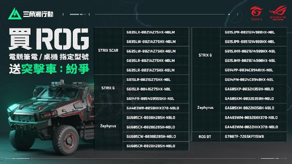 購買 ROG 電競筆電或桌機,帶回《Garena® 三角洲行動》專屬載具造型