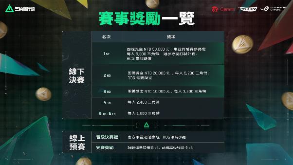 本次《賞金獵人賽》特別與華碩電競潮牌 ROG 攜手合作,從硬體支援至比賽體驗全面升級。總決賽將全程使用 ROG 頂規電競設備,強勢助攻參賽選手發揮個人無限潛能。優勝隊伍除獲得豐厚獎金外,更將獲頒 ROG 獨家好禮,歡迎各路好手踴躍報名參加!