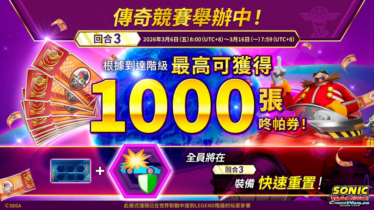 世雅股份有限公司宣布,有關好評發售中的《索尼克賽車 交叉世界》,已決定在2026年3月6日(五)於遊戲內舉辦頂尖賽車手專用賽事「傳奇競賽 回合3」。