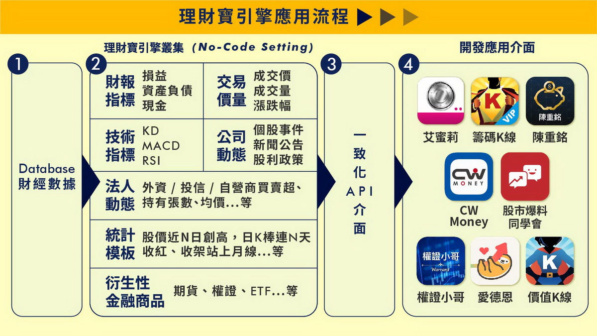 奠基在深厚的資料處理能力上,CMoney除了替全職操盤人設計投資工具產品,更積極打造一般投資人也好上手的App。各類投資模式或是專家知識,CMoney均能把盤後資料導進雲端運算後,再直接以API傳到前端,將運算後的數據邏輯轉化成各類工具型軟體上的參考指標,讓用戶省去大量抓資料、計算的時間。CMoney的軟體開發速度非常快,平均兩周可推出一支App,相較一般開發App的效率快了近10倍[1],API化的運作模式,也使各種投資數據能更即時回應市場需求,甚至廣泛應用於不同領域。