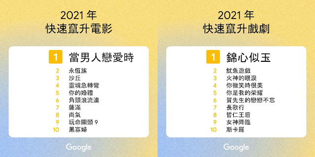 延續去年的國片熱度,年度快速竄升電影冠軍是獲得金馬獎四項大獎提名的《當男人戀愛時》,真實反映社會底層人物的愛情故事,票房開出長紅,也引發關注;而一度無法進入院線播映的好萊塢電影,今年強勢回歸,包括《永恆族》、《沙丘》、《尚氣》以及《黑寡婦》都上榜。電視劇方面,除了陸劇《錦心似玉》、《你微笑時很美》等備受矚目外,透過新穎題材反映韓國社會問題的《魷魚遊戲》,風靡全球,也是台灣網友熱議的年度夯劇。此外,入榜的兩部台劇,分別是逼真呈現打火英雄任務現場的《火神的眼淚》以及改編自得獎小說《傀儡花》的歷史劇《斯卡羅》也受到台灣網路使用者高度關注。