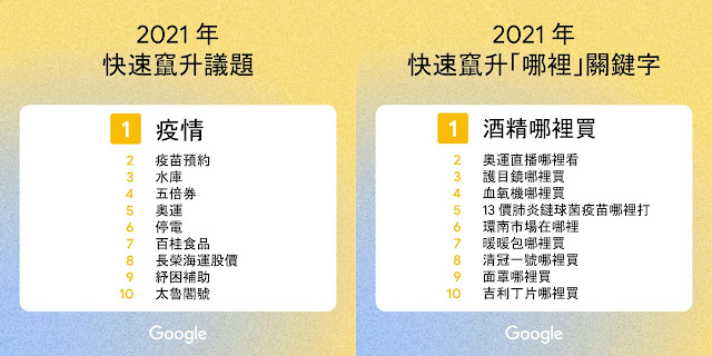 回顧年度十大快速竄升議題,由於疫情影響生活各個層面,仍最受台灣民眾關切;而快速竄升的「哪裡」關鍵字,也顯示酒精、護目鏡、快篩試劑等防疫物資,以及疫苗施打、疫情熱區、在家自製甜點的材料,都是網友搜尋的重點。