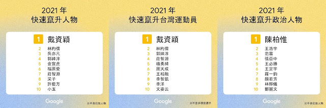 今年竄升人物榜單也顯示奧運的熱度,有 4 位代表台灣出征 2020 東京奧運的運動選手上榜,包括「戴資穎」、「林昀儒」、「郭婞淳」以及「莊智淵」。除了廣受民眾愛戴的選手以外,「吳亦凡」、「金宣虎」、「福原愛」等名人動向也引起熱搜。至於快速竄升「政治人物」榜單,則反映台灣民眾透過搜尋關鍵人物,近一步獲得資訊了解、參與公共事務,包括因罷免案備受矚目的「陳柏惟」與「王浩宇」、參選國民黨主席的「張亞中」,以及立委補選候選人「林靜儀」等都榜上有名。