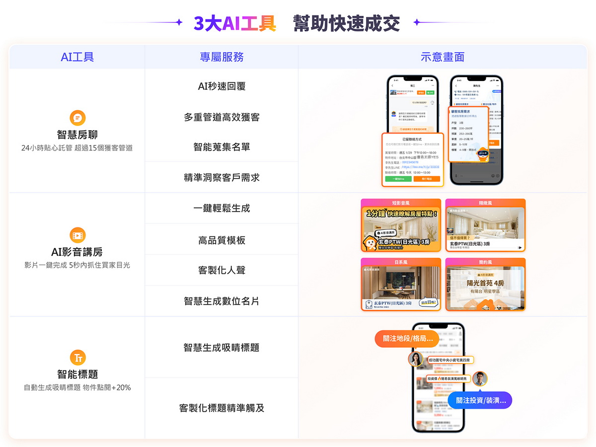 圖/「智慧房聊」、「AI影音講房」、「智能標題」三大AI工具,預計可提升聯絡效率50%。