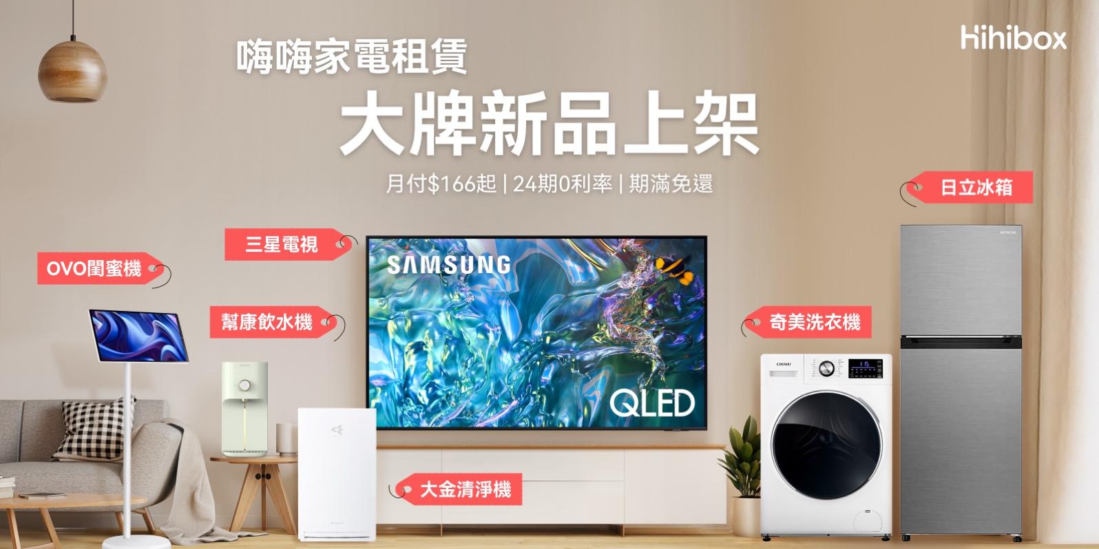 OVO旗下嗨嗨(Hihibox)家電租賃平台於年初上線,主打超低月付、24 期分期、租期保固、期滿免還與可選到府服務等特色。新加入有三星電視與聲霸、日立冰箱與濕拖掃地機器人、奇美洗脫烘洗衣機、大金空氣清淨機等商品,累積共 11 個品類、21 款機型。家電六大件,電視、冰箱、洗衣機、清淨機、洗碗機、飲水機全都有!推出至今最受消費者青睞的前 3 名是幫康RO飲水機、幫康免安裝洗碗機以及 Warpple 轉轉閨蜜機。