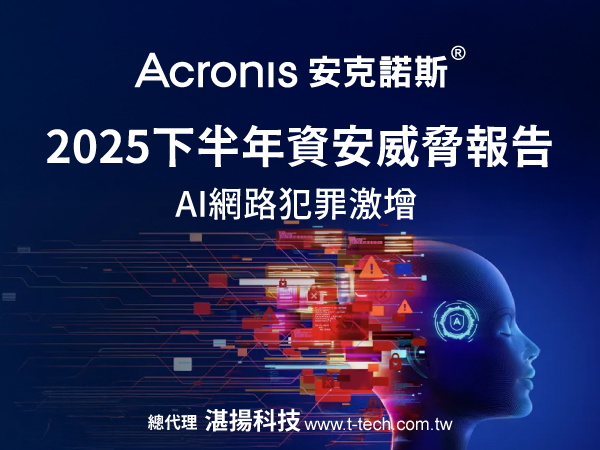 安克諾斯®總代理湛揚科技表示,Acronis Cyber Protect提供整合AI型防惡意軟體、防勒索軟體、URL篩選及弱點評估等多層防護機制,可即時偵測並阻擋各類進階威脅,協助企業全面強化端點與整體資安防護能力。更多Acronis產品資訊,請瀏覽湛揚科技官網 https://www.t-tech.com.tw或電 02-2515-1585,我們將為您提供最完整的資安防護建議。完整《2025下半年網路威脅報告》請點我立即下載。