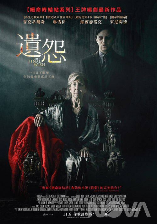 說出你的願望!《絕命終結站系列》王牌編劇突發奇想,竟想打造黑暗版的阿拉丁神燈?《遺怨》故事講述在父親過世後,主角回到老家參加喪禮並安撫悲慟不已的母親。在整理父親的遺物時,注意到了一個奇妙的骨董,並發現只要向這個骨董許願,說出「我希望…(I wish…)」任何願望都會實現!但是,天底下沒有白吃的午餐,最終的代價將是靈魂將歸屬於惡魔,主角能逃離恐怖的詛咒平安無事嗎?國外影評及網友看完直呼「這根本是《絕命終結站》遇上恐怖小說《猴掌》」「太可怕!黑暗版阿拉丁」不只故事精彩,演員們也是大家熟悉的面孔《陰兒房系列》「美國龍婆」琳雪伊、絲賓瑟洛克、《絕命終結站》東尼陶德以及《暮光之城系列》麥克韋爾奇,絕對不能錯過的恐怖新作!《遺怨》將於11月8日在台上映。