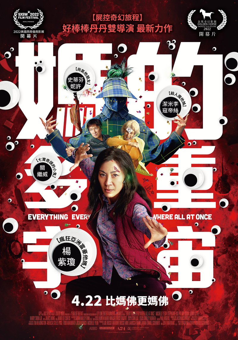 比「媽佛」更「媽佛」的電影《媽的多重宇宙》由《復仇者聯盟》系列導演羅素兄弟(Russo Brothers)擔任監製,《屍控奇幻旅程》「丹丹」丹尼爾關(Dan Kwan)和丹尼爾舒奈特(Daniel Scheinert)雙導演執導,漫威團隊製作,《瘋狂亞洲富豪》楊紫瓊、《七寶奇謀》關繼威、《月光光心慌慌》潔米李寇帝絲(Jamie Lee Curtis)、《尚氣與十環傳奇》史蒂芬妮許(Stephanie Hsu)擔綱演出,超狂組合讓電影上映前就備受矚目;該片講述美國華裔移民秀蓮每天家庭事業兩頭燒,在老爸爸生日大壽這天要阻止女兒暴走出櫃,還要帶著軟爛的丈夫跟老爸爸去面對稅務局大嬸,未料老公竟然搖身一變演起駭客任務說自己是另一個宇宙來的,邪惡勢力將毀滅地球,只有在這位「媽」的宇宙裡、一無是處的秀蓮有機會拯救世界。無厘頭又腦洞超展開的內容,也做為美國西南偏南影展(SXSW)以及金馬奇幻影展的開幕片,4月22日要突破觀眾的想像看最強大媽穿越宇宙救世界。