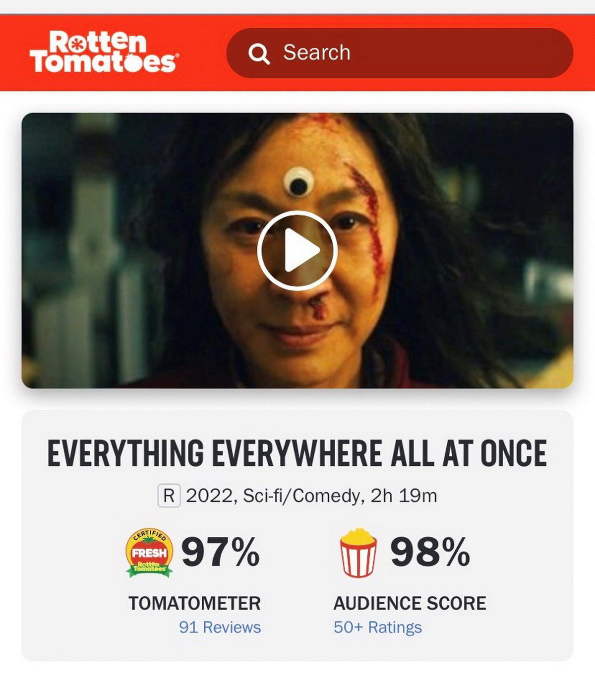 但從完美又優雅的武打巨星變身成普通的「歐巴桑」對楊紫瓊也是不小的考驗,扮醜是其次,如何隱藏女王氣場丟掉功夫底子才是多年來累積的豐富經驗,「丹丹導演」丹尼爾關(Dan Kwan)和丹尼爾舒奈特(Daniel Scheinert)一直不斷提醒她:「不要打得太好!」一下子要變成功夫女巨星,一下子要變成市井小民,隨後還要帶著迷茫眼神展露專業的身手,楊紫瓊從眼神、表情、肢體等成功塑造出戲中的「小蓮」。《媽的多重宇宙》在演員們精湛的表演之下,有豐富又多層次的劇情,在IMDb有8.8分的好評,爛番茄也掛出品質保證,不只有97%新鮮度,觀眾分數最高達到98%,IGN也給出10分滿分,海外觀影過的觀眾們大讚:「毫無尿點」、「二刷也不夠」。