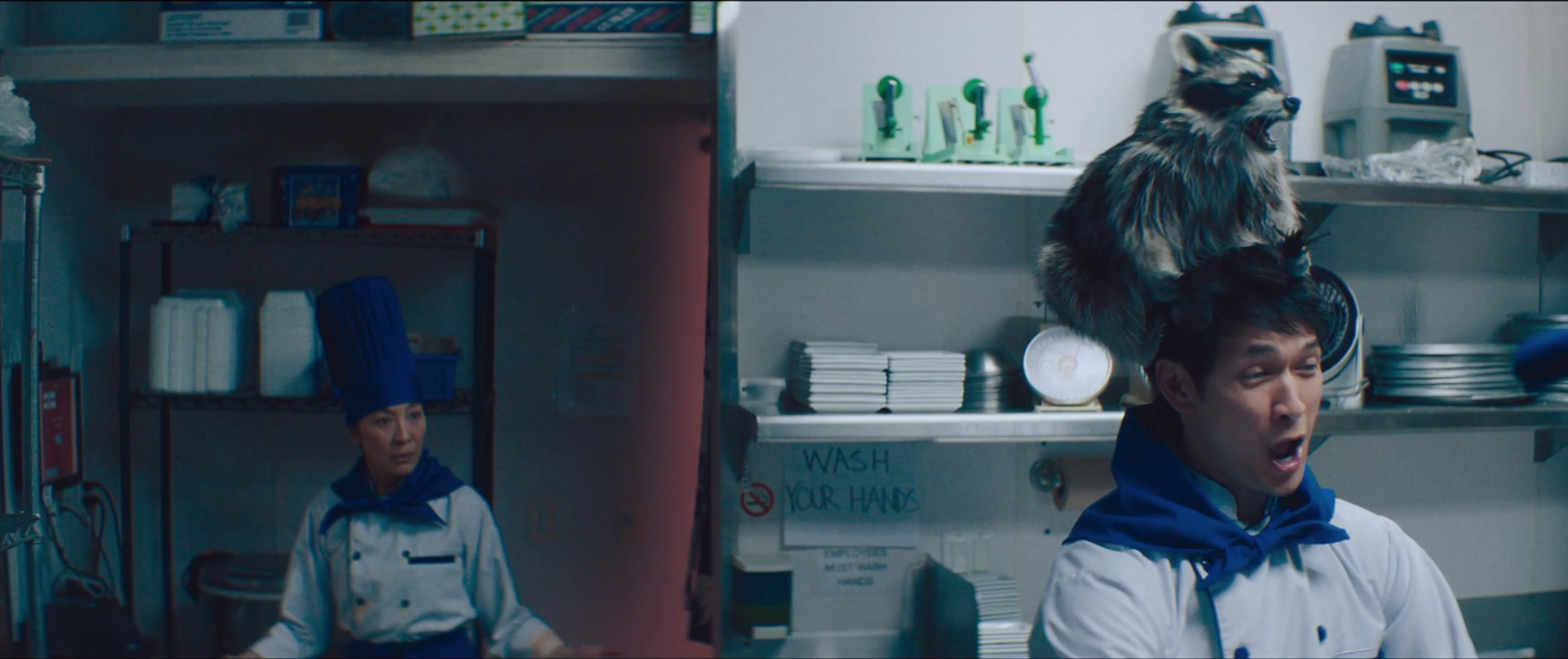 顛覆宇宙觀的《媽的多重宇宙》上映以來在海內外獲得許多熱議:「很難用一句話形容的電影」,本週一(25日)起拿下全台票房冠軍,儘管疫情升溫,話題還是不斷洗版,引發更多影迷想一探究竟的心情,戴好口罩、噴酒精穿防護衣,或是挑選早、晚場次,做好相關配套措施看大銀幕體驗。最近也登上「TIME時代雜誌」被拿來與漫威跟DC各電影的宇宙一起討論,《媽的多重宇宙》其中最令人捧腹大笑的就是致敬《2001:太空漫遊》的「熱狗手手」宇宙,打敗人類祖先的「熱狗手猿人」竟然是導演丹尼爾舒奈特(Daniel Scheinert)親自扮演,而且因為猿人套裝只有兩件,他幾乎一人分飾多「猿」在山脊跑了一整天,站在不同位置並且各種角度用熱狗手擺出勝利手勢,再透過後製技術呈現一群熱狗手猿人慶祝征服宇宙;不只如此,丹尼爾舒奈特還在電影裡跟楊紫瓊大玩SM被打屁屁。