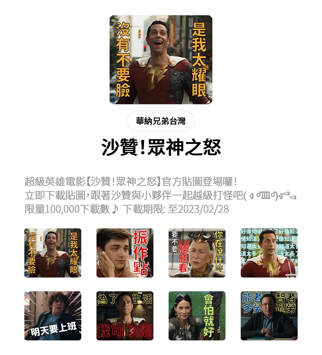 最新DC超級英雄電影【沙贊!眾神之怒】,故事接續描述青少年比利貝特森只要喊一聲「沙贊!」,就會立刻變身為成人身體的超級英雄沙贊,並將與其他家族成員對上更強大的反派及怪獸。【沙贊!眾神之怒】今天也推出LINE官方貼圖,呈現沙贊一貫的中二的搞笑風格。