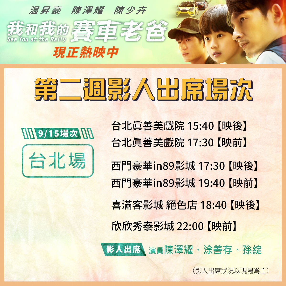 《我和我的賽車老爸》在觀眾們的熱烈好評與支持下,演員陳澤耀、涂善存、孫綻三人也確定將在本週五(9/15)晚間,在台北的真善美劇院、in89豪華影城、喜滿客影城絕色店、欣欣秀泰影城進行多場戲院見面會,請密切留意官方社群公告,並提早購票與影人近距離會面。