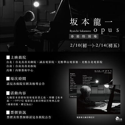 由坂本龍一竭盡全力進行的最後一場音樂會電影《坂本龍一:OPUS》,即將在2月10日(六)至14日(三)期間加開「春節特別場」,3月15日於台灣正式上映。本片紀錄以優美旋律為全球樂迷帶來感動與慰藉的音樂大師坂本龍一,他竭盡全力演奏出他音樂生涯的20首經典曲目。悠揚的琴音在舞台與燈光之間流淌,時而慑人心神,時而令人屏息。坂本龍一的最後一場演奏,也是他以音樂獻給全世界的美麗問候。欲知本片最新消息,請上電影官方臉書粉絲團https://www.facebook.com/ccasiaworld與Instagram專頁https://www.instagram.com/caichang_film查詢。