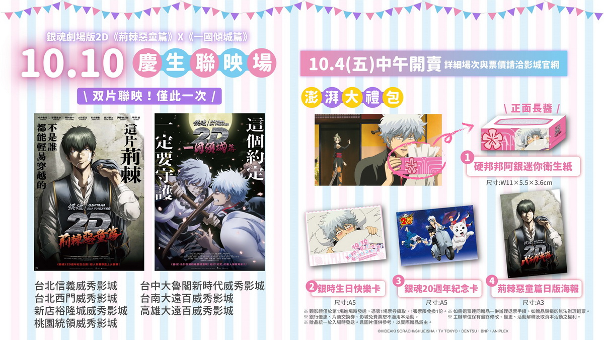 《銀魂劇場版2D 一國傾城篇》將於10月18日正式上映,在此之前,威秀影城將於10月10日(雙十節)舉辦慶生連映場,串聯台北信義威秀、台北西門威秀、新店裕隆城威秀、桃園統領威秀、台中大魯閣威秀、台南大遠百威秀以及高雄大遠百威秀等北中南七家影城,同步上映《銀魂劇場版 2D 荊棘惡童篇》與《銀魂劇場版 2D 一國傾城篇》兩部電影,精選特典包括:「硬梆梆阿銀迷你衛生紙」、「銀時生日快樂卡」、「銀魂20周年紀念卡」與「荊棘惡童篇日版海報」等,預計將於10月4日(五)開賣,詳情與場次請洽威秀影城官網,粉絲們千萬把握住這個可以與同好們一起同樂的大好機會!