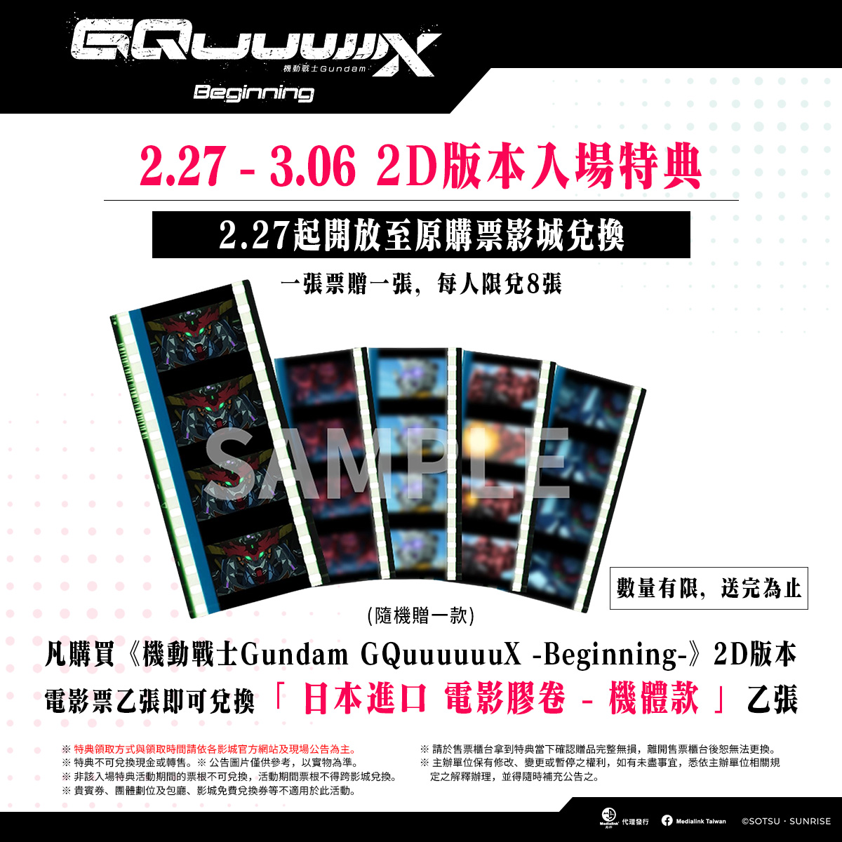 為回饋粉絲熱情支持,電影公司將推出購票送限定特典的活動:凡購買IMAX版本電影票乙張,即可兌換「IMAX」海報乙張及「原創設定冊子」乙本。每一張票贈送一組,一人限兌8組;而購買一般2D版本電影票乙張的觀眾,可隨票獲得「電影膠捲 機體款」一張,隨機贈送一款,每人限兌8張。數量都極為有限,送完為止,喜歡的觀眾趕緊手刀購買,這波特典預計將掀起鋼彈迷的收集與觀影熱潮,粉絲們絕對不容錯過。