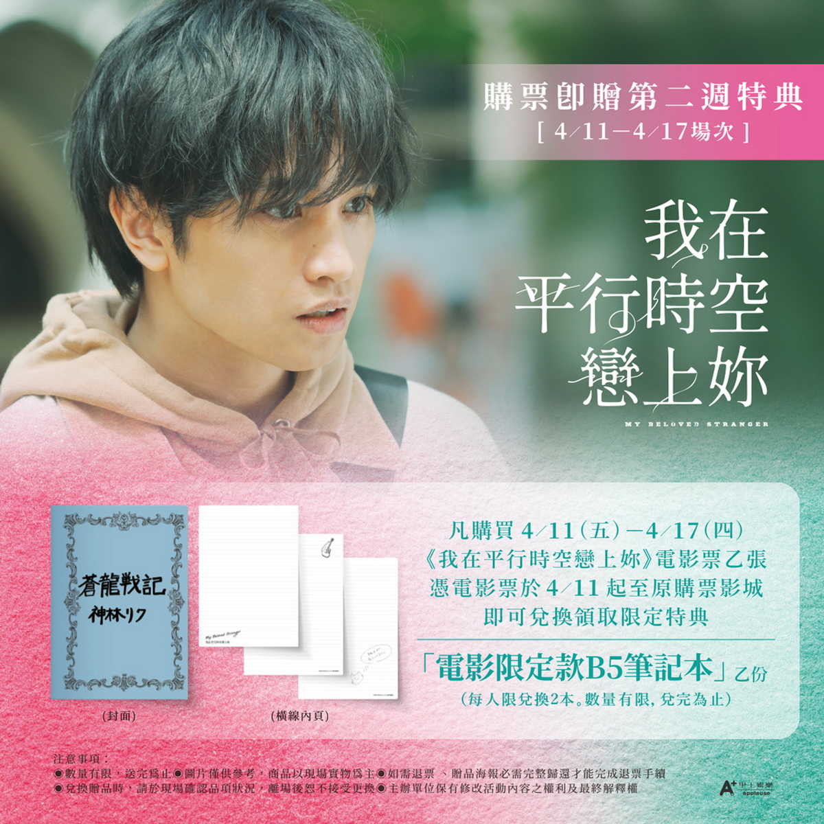 《我在平行時空戀上妳》現正在台浪漫獻映,凡購買上映首週4/2(三)至4/10(四) 電影票乙張 ,即可兌換領取台灣限定特典「甜蜜CP版」A3海報乙張,次週4/11(五)至4/17(四)購買電影票乙張,則可兌換「電影限定款B5筆記本」乙份,更多資訊請追蹤甲上娛樂粉絲團。