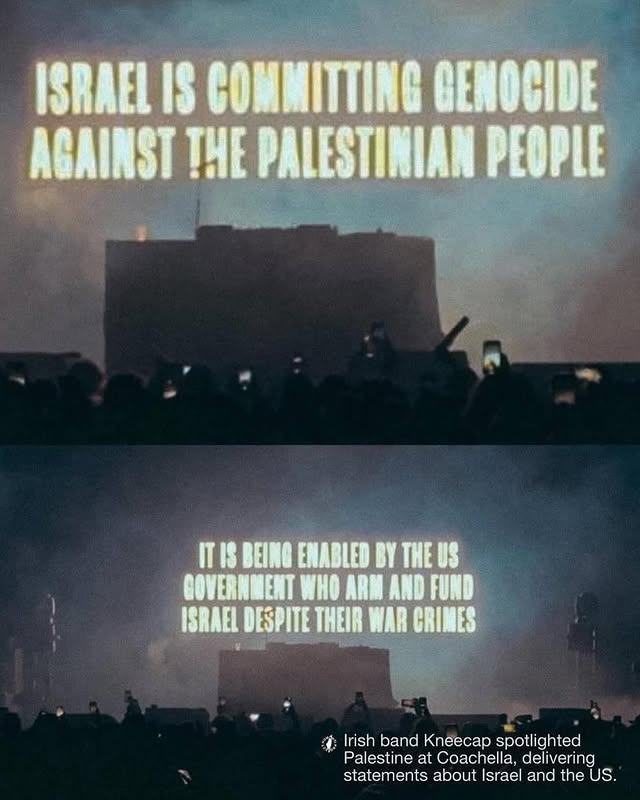 近日剛結束的科切拉音樂節Kneecap 成員莫查拉(Mo Chara)在4月18日演出中,頭戴象徵巴勒斯坦身份的黑白格 keffiyeh 圍巾登台,並投影出三段文字訊息:
