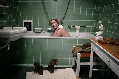 值得一提的是,《她眼中的世界》更震撼重現黎米勒諷刺歷史瞬間的最具代表性攝影作「在希特勒的浴缸裡」。凱特溫絲蕾認為本片有責任且必須非常細緻還原該場景,確保敘事內容盡可能貼近真實,她表示:「因為那是黎米勒最具代表性的影像之一,我們必須非常細緻地還原她當時為何會出現在那個場景當中。這是我們在整部作品中最感責任重大的部分之一,確保敘事內容盡可能貼近真實,反映她當時可能的情感與思緒。」拍攝該場景時,她更在《Vogue時尚》雜誌總編安娜溫圖(Anna Wintour)的引薦下,請到當代傳奇攝影師「安妮萊柏維茲」(Annie Leibovitz)還原這張照片,憶起這場重點場面的拍攝過程,凱特溫絲蕾也不經讚嘆:「那場戲極其震撼,令人難以置信!」