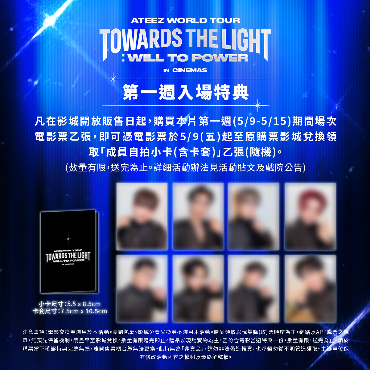 值得一提的是,為了讓每位ATINY都能更深刻體驗這場視覺與音樂的震撼之旅,片商也祭出超有誠意的「首週戲院限定入場特典」!只要在影城開放販售日起,購買《ATEEZ WORLD TOUR [TOWARDS THE LIGHT : WILL TO POWER] IN CINEMAS》第一週(5/9-5/15)期間場次電影票乙張,不限版本,即可憑電影票從5月9日起,至原購票影城兌換領取「成員自拍小卡(含卡套)」乙張(隨機發放),數量有限,送完為止。尤其在電影院體驗完ATEEZ的火熱舞台之後,可以拿著成員們的自拍小卡,那份驚喜與感動絕對加倍提升!每張小卡都代表著成員們的專屬魅力,是ATINY與ATEEZ之間最真實且最忠誠的連結,不論是自己收藏還是送給朋友,都是無可取代的心意與珍貴逸品。而且這些小卡只會在首週限定期間送出,時間一過,就再也無法擁有!快來搶票,把成員的小卡握在手中,萬萬別讓這個千載難逢的機會從指尖溜走。同時,片商也特別提醒所有觀眾,請勿在戲院內拍照、錄影或錄音,也禁止將銀幕畫面上傳至社群平台;任何未經授權的錄影行為,將觸犯《著作權法》第91條,最高可處五年有期徒刑。請大家一同以正確方式守護ATEEZ與電影創作團隊的心血,讓我們攜手共創最美好的觀影體驗!