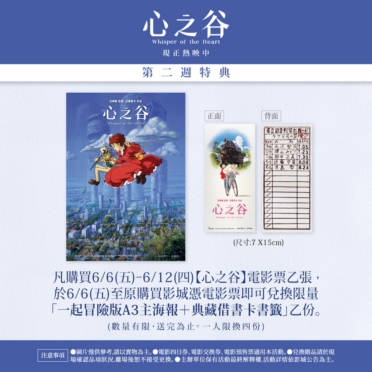 由宮﨑駿監製、編劇的吉卜力浪漫經典動畫《心之谷》上週四重返全台大銀幕,貫串全片的金曲〈鄉村路〉一奏,紛紛令觀眾感動落淚,首週末即衝上新片票房冠軍,全網口碑爆棚,力推一定要看大銀幕,感受「國民初戀」天澤聖司的浪漫魅力及日本動畫史上首部引入杜比立體音效的電影。繼首週特典聞得到「香香的聖司」後,第二週特典加碼祭出吉卜力迷都想擁有的雙重好禮──「聖司借書卡典藏書籤」及《心之谷》海報主視覺「一起冒險A3電影主海報」,兩種特典皆採用厚磅美術紙,主海報透過局部上光營造月島雯與貓男爵的靈動跳躍立體感,書籤則為雙面設計,借書卡的背面是聖司騎單車載著月島雯的經典電影視覺,尺寸接近智慧手機大小,還原借書卡的真實手感。