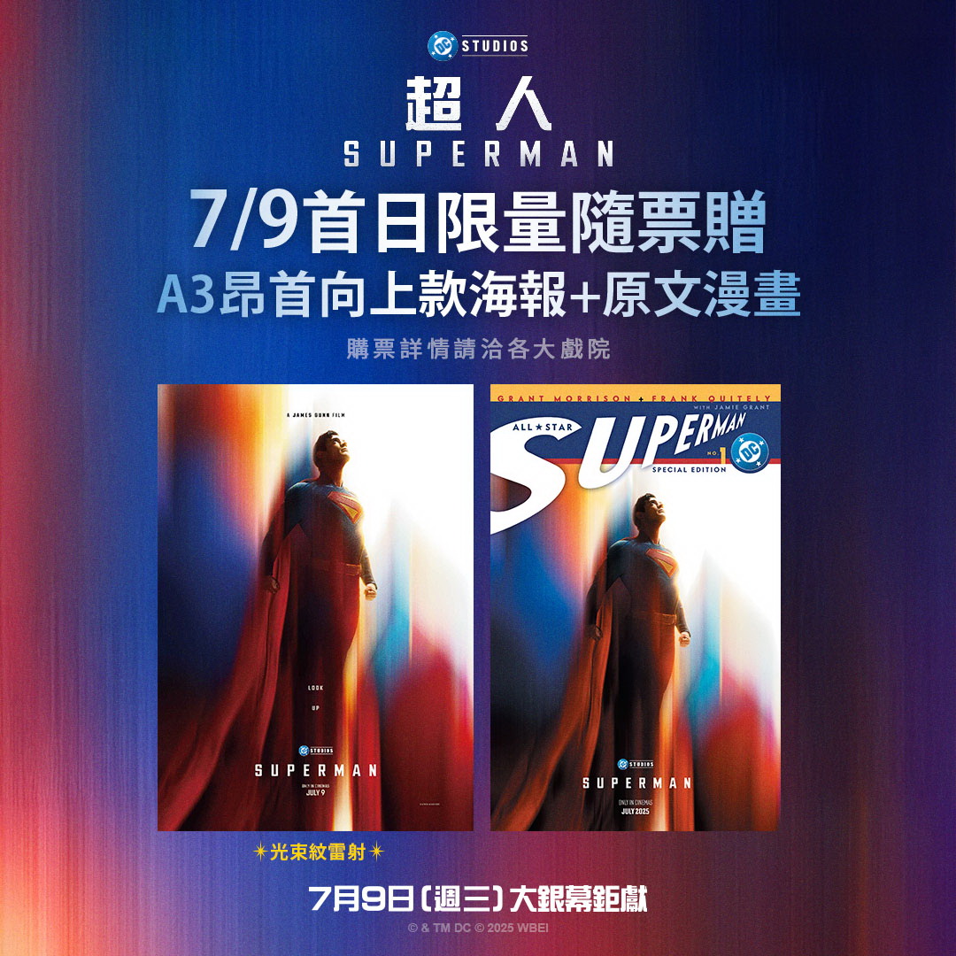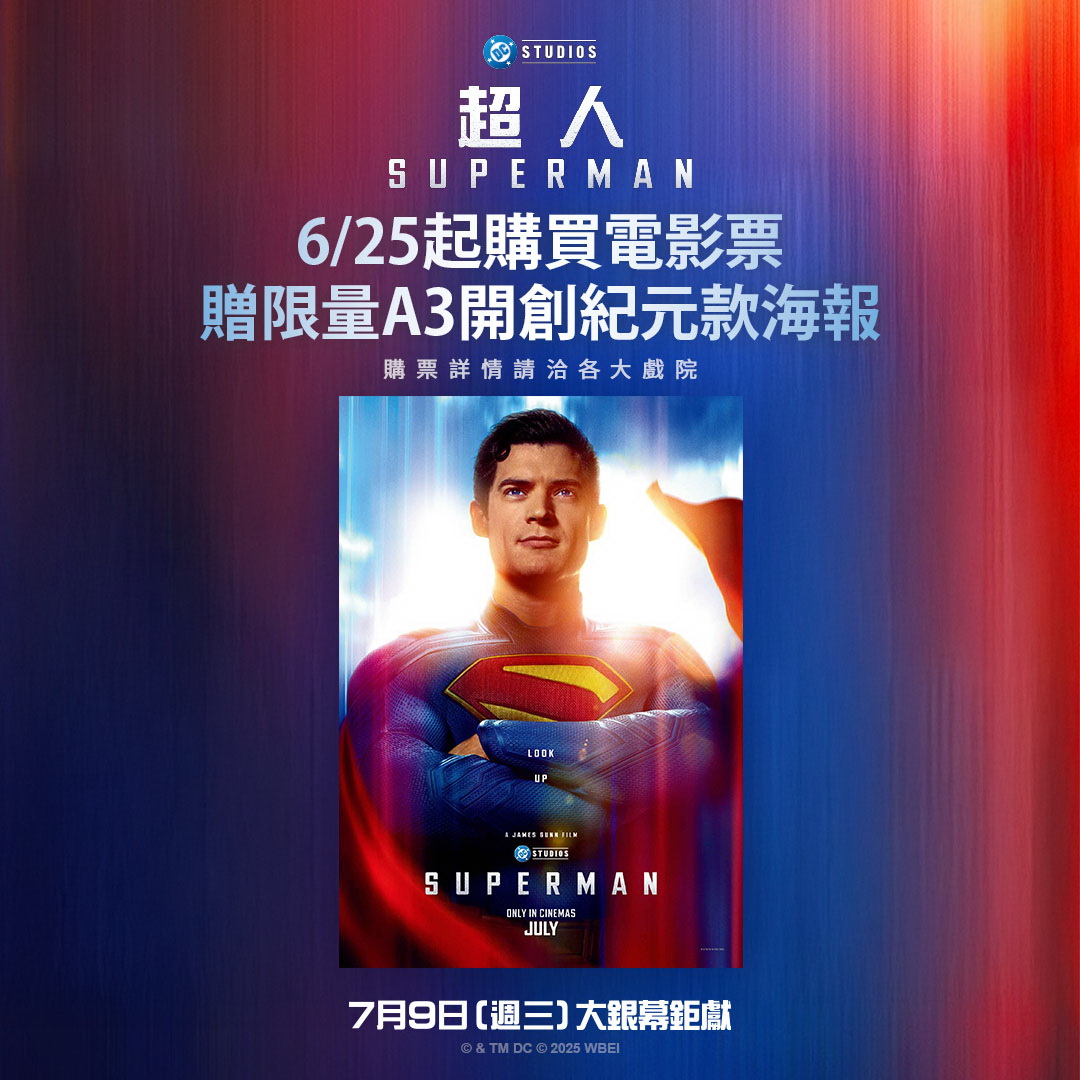 【超人】預售票將於今天(6/25)開賣,購票即可獲得限量「開創紀元款」海報,首日場次更將隨票贈「昂首向上雷射光束A3海報」、原文漫畫等限量特典,詳情請洽各大影城。電影將於7月9日(週三) 2D · 3D · IMAX · 4DX · MX4D · Atmos · Dolby Cinema · SCREENX同步上映。