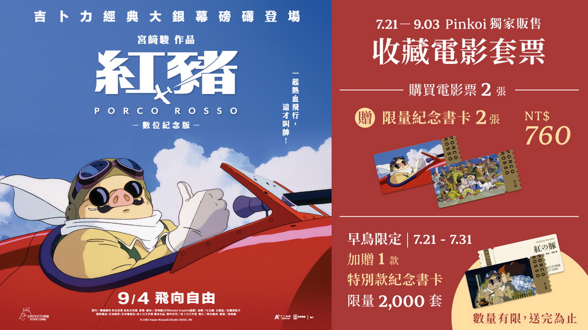 被譽為吉卜力工作室「最熱血神作」的《紅豬》重返大銀幕,將於9月4日在台磅礡上映。宮﨑駿經典鉅作《紅豬》透過壯闊的飛行艇空戰場面以及感動人心的冒險劇情,當年在日本以54億日圓的亮眼佳績榮登年度日本票房冠軍,繼《魔女宅急便》後,再度刷新日本動畫電影票房新高。全片充滿著宮﨑駿最熱愛的戰鬥機、奇幻以及浪漫愛情等元素,因而被許多粉絲認定與《風起》、《蒼鷺與少年》並列,同樣是宮﨑駿最私密、最真誠的自傳作品。一生必看的宮﨑駿經典之作《紅豬》重返大銀幕,片商甲上娛樂與Pinkoi合作推出全球唯一復古票卡收藏套票,將於今(7/21)晚上6點開賣,吉卜力迷預購從速,以免向隅。