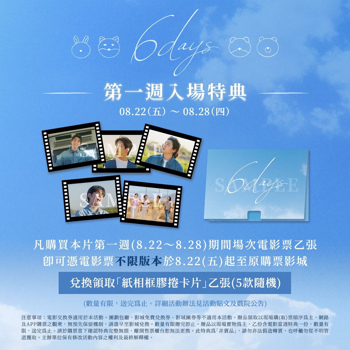 迎接出道十週年的超人氣實力樂團「DAY6」,首部音樂公路電影《6DAYS》,即將在本週五(8/22)於台灣隆重上映。本片描述為了慶祝出道十週年,DAY6四位成員——晟鎮、Young K、元弼與度云——在圓滿結束世界巡演後,展開一場為期六天的美國公路之旅。這趟旅程沒有明確計劃,只有一台車、一群夥伴,以及無盡的前方。起初,旅程像是一場輕鬆假期,隨興彈唱、自在駕車,甚至在沙漠中駕著越野車奔馳,感受自由氣息。沿途偶遇音樂人,與其暢談音樂,以及意想不到的挑戰接踵而來。他們逐漸在陌生風景中彼此靠近,進行真誠對話,並回望這十年來的心路歷程。這場宛如Man in a Movie般的電影之旅,紀錄下DAY6與My Day一同走過的燦爛時光——而這場融合音樂、友情與青春的冒險,都將凝聚為他們生命中最重要的旋律。欲知本片最新消息,請上電影官方臉書粉絲團https://www.facebook.com/ccasiaworld與Instagram專頁https://www.instagram.com/caichang_film查詢。