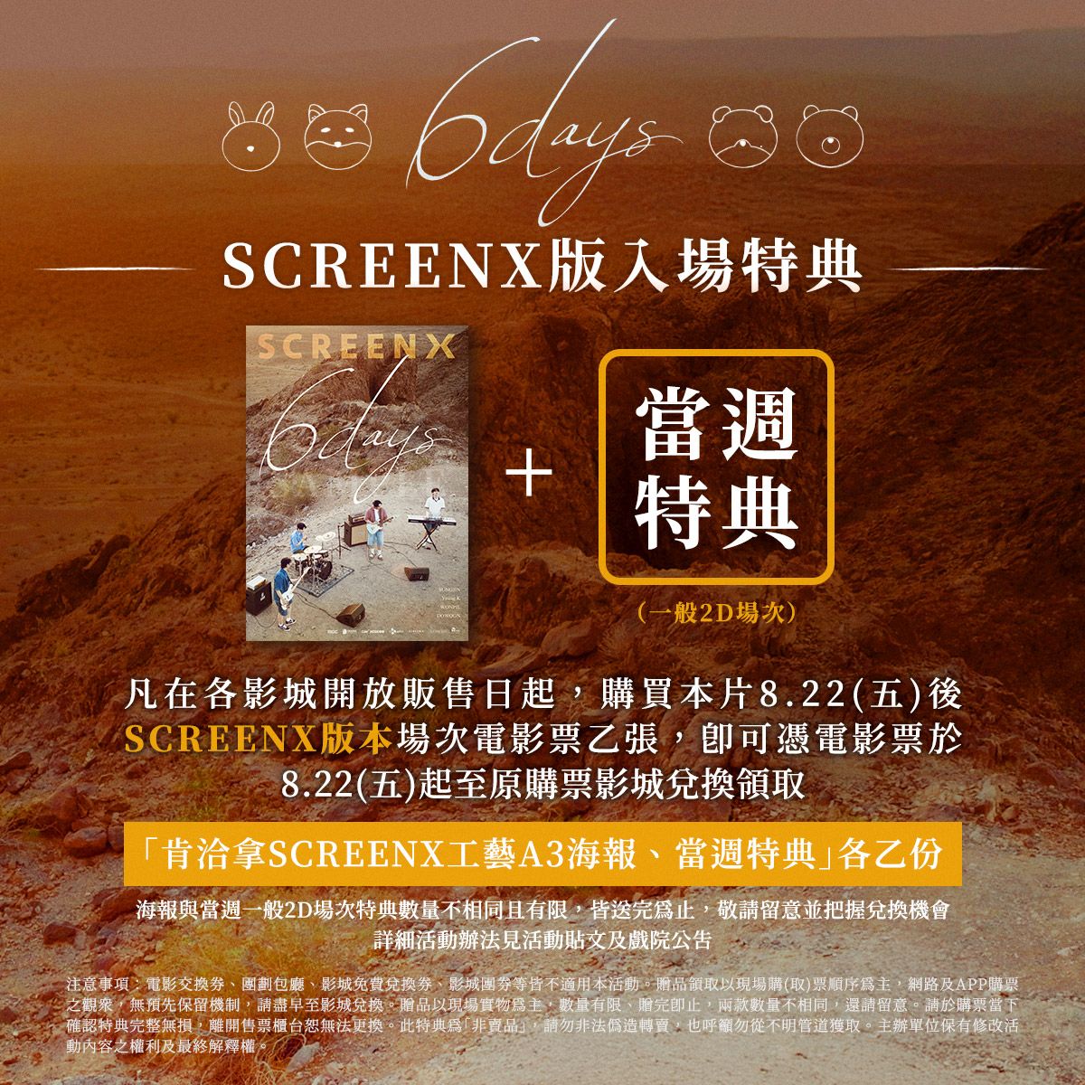 值得一提的是,《6DAYS》除了2D版本之外,台灣也將同步上映SCREENX與4DX版本,提供觀眾更豐富的觀影體驗。SCREENX版本將結合中央銀幕與左右兩側延伸的三面銀幕,成員更將從三面銀幕上現身,讓觀眾在欣賞DAY6目不暇給的精彩表演,同時還能生動體驗到沙漠、海灘、懸崖等美國西部廣闊而充滿異國情調的景緻,再透過寬廣畫面展現,以最大程度提升觀賞沈浸感。此外,4DX 版本則讓觀眾有如成為DAY6成員般的臨場感,進一步提升期待值。從成員親自駕車時的引擎震動、迎面吹拂而來的微風,再到淡雅的香氣,真實呈現出DAY6的公路之旅,再配合隨著樂團演奏節奏而律動的動感座椅效果,將帶來與眾不同的觀影體驗。眾多南韓觀眾也在觀賞後紛紛表示:「能和DAY6與美麗的星辰一起開懷大笑、落淚,真是太棒了!」「就像回顧DAY6一路走來的漫長旅程,看電影時總是心潮澎湃!」「是一場視覺和聽覺的盛宴!」「回顧DAY6的十年歷程,既感人又歡樂!」