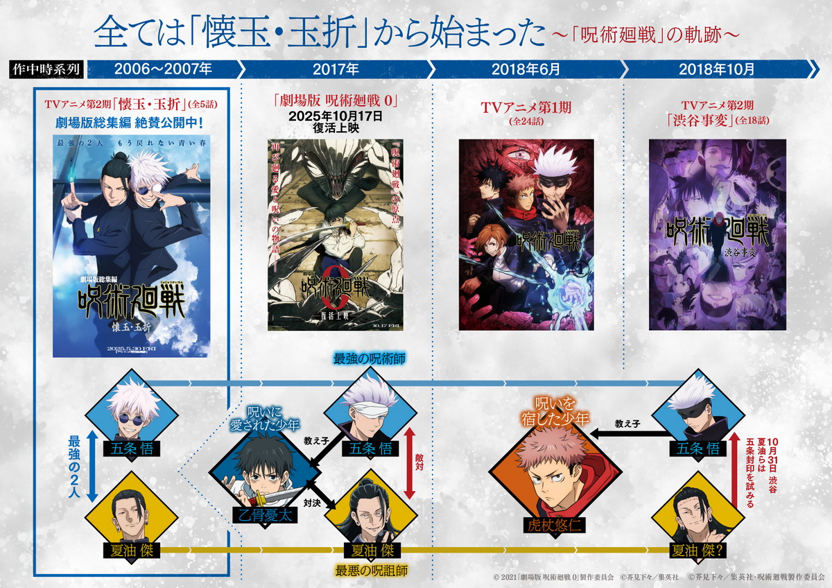 9月5日打頭陣的是五條悟與夏油傑在高專時期的故事:《劇場版 咒術迴戰 懷玉玉折》,故事設定在2006年,二年級生的五條悟與夏油傑奉命保護一位名為天內理子的少女,她體內的「星漿體」讓她背負每500年與天元大人同化的宿命,藉以維持咒術界的恆久穩定,任務中,自信滿滿的兩人遭遇殺手伏黑慎爾的伏擊,伏黑慎爾不僅威脅了護衛任務的執行,更徹底顛覆兩人的信念與命運,讓兩人從此走上不同的道路。