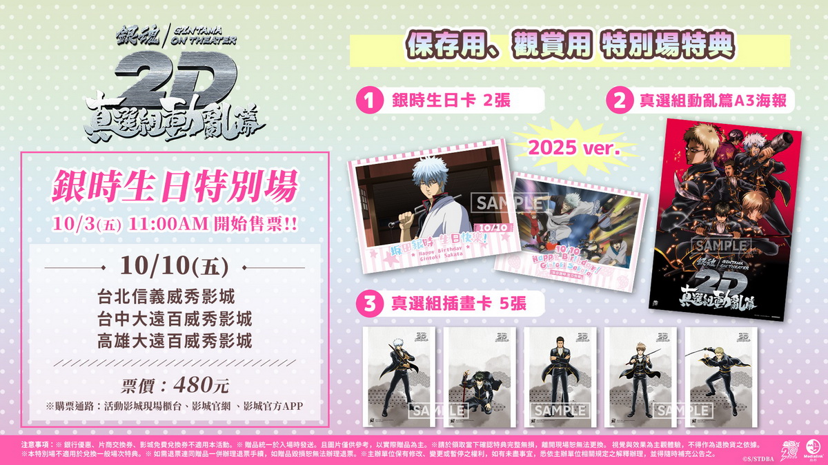10月10日的「銀時生日特別場」將於 台北信義威秀影城、台中大遠百威秀影城、高雄大遠百威秀影城 同步舉行,並於 10 月 3 日上午 11:00 正式開賣。觀眾凡購票即可獲得精美特典: