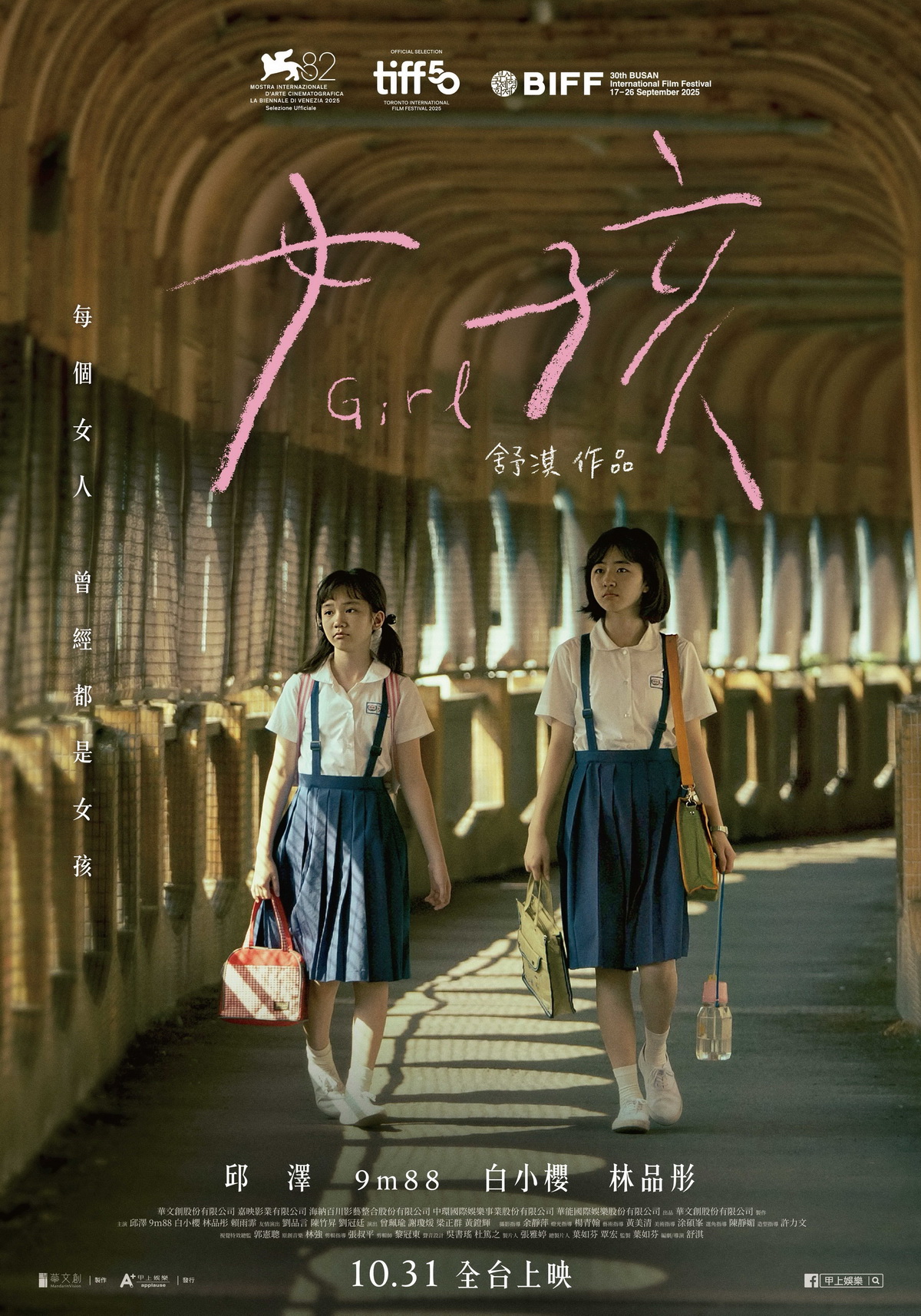 《女孩》劇情描述1988年基隆港在時代進化下煙塵蔽日,女孩林小麗(白小櫻 飾)在迷惘中長大,渴望逃離黑暗。直到遇見無懼眼光、自在生活的李莉莉(林品彤 飾),她才第一次看見世界的色彩。然而,這份嚮往卻觸動了母親阿娟(9m88 飾)的過往創傷:當年,她也曾憧憬未來,卻被現實困住。女孩與女人,在交錯的命運中互相映照,像一面鏡子照出彼此的傷痛卻無能為力。《女孩》由華文創股份有限公司製作,將於10月31日在台搶先全亞洲上映,更多相關資訊請鎖定甲上娛樂官方FB:facebook.com/applausemovietaiwan/、官方IG:instagram.com/applausemovie_taiwan/