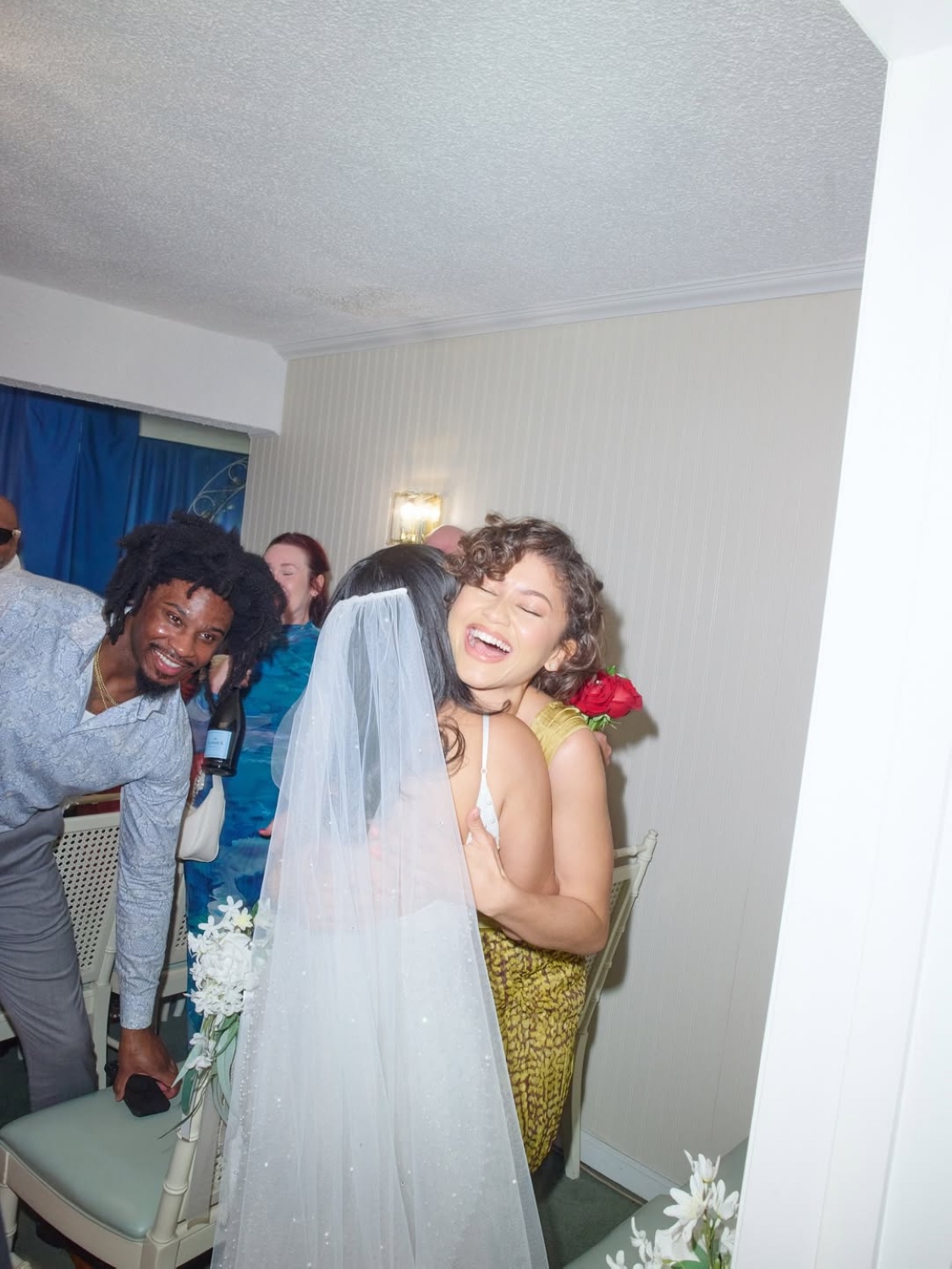 本片這場活動也不是隨便辦辦,只見現場紅毯、鮮花拱門、氣泡酒、攝影師通通齊全,並請到片中飾演伴娘、同時也是知名樂團「海慕樂團」成員的艾拉娜海姆,擔任教堂開幕DJ,以一首首經典愛情名曲炒熱現場氣氛。沒想到,當婚禮進行到一半時,主演本片「新娘」的千黛亞驚喜現身,身穿宛如一抹明媚陽光的黃色上衣與印花裙,搭配輕盈俏麗的新短髮造型出現,引發眾人連連驚呼。她不僅留在現場觀禮,為新人們熱烈鼓掌,甚至成為其中一對幸運新人的證婚人,為他們簽署結婚證書,送上真摯祝福。