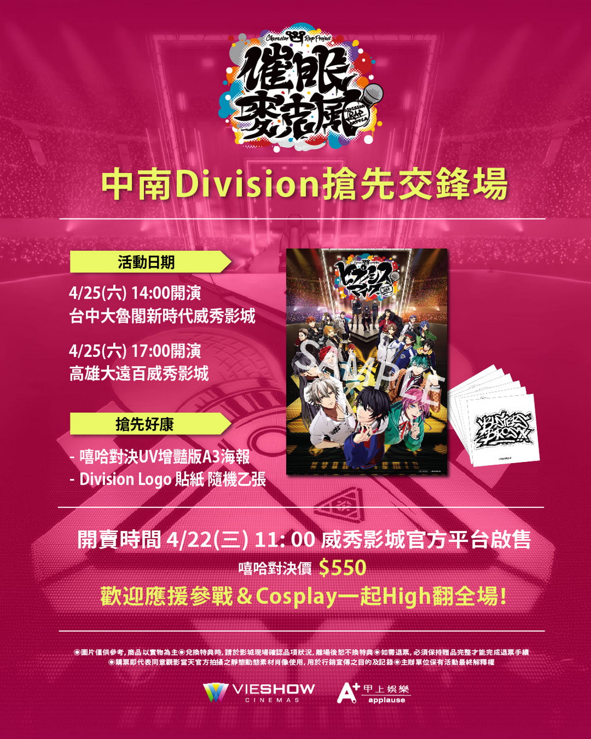 《催眠麥克風》搶先場資訊今同步公開, 4/25 分別於台中大魯閣新時代威秀及高雄大遠百威秀影城舉辦「中南Division搶先交鋒場」,隔天 4/26 則於 MUVIE CINEMAS 台北松仁威秀影城舉辦「全台唯一 TITAN SCREEN 特別場」,購票將搶先獲得首週特典「嘻哈對決UV增豔版 A3 海報」、「Division Logo 貼紙」(隨機乙張)限定特典好禮,預售票將於本週三(4/22)上午 11:00 於威秀影城官方平台啟售,歡迎粉絲攜帶手燈及 Cosplay 應援,一起沉浸式享受 High 翻全場!