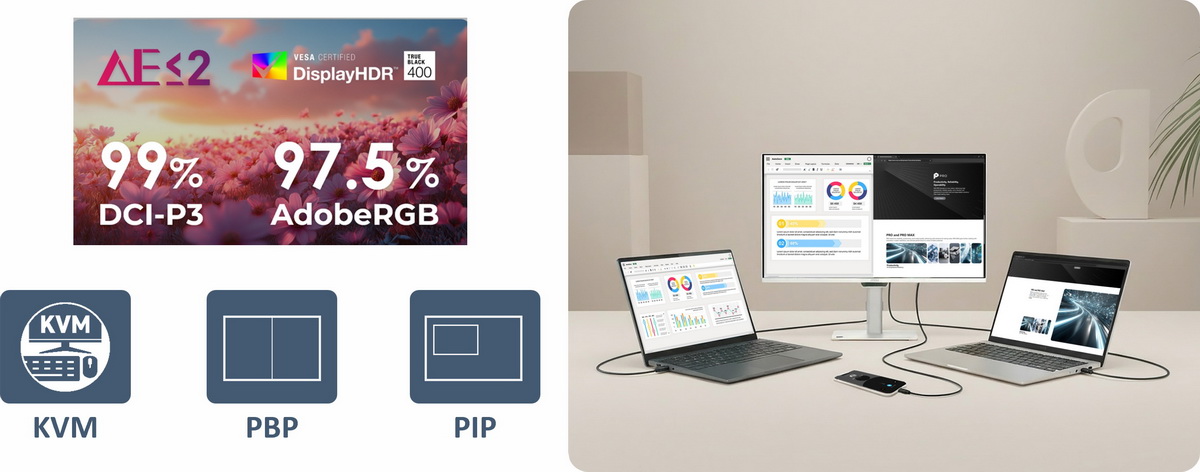 PRO MAX 271QPHW E14 採用WQHD高解析,提供更細膩的畫面表現與更寬廣的視野範圍,適合多工處理與專業應用;而 PRO MAX 271PHW E14 則搭載 FHD解析度,兼顧效能與價格,滿足日常辦公與商務需求。兩款機型皆支援144Hz高更新率、配置Delta E ≤ 2與支援KVM,內建雙喇叭,無論是商務處理或影音/影像工作者,都能完美使用。