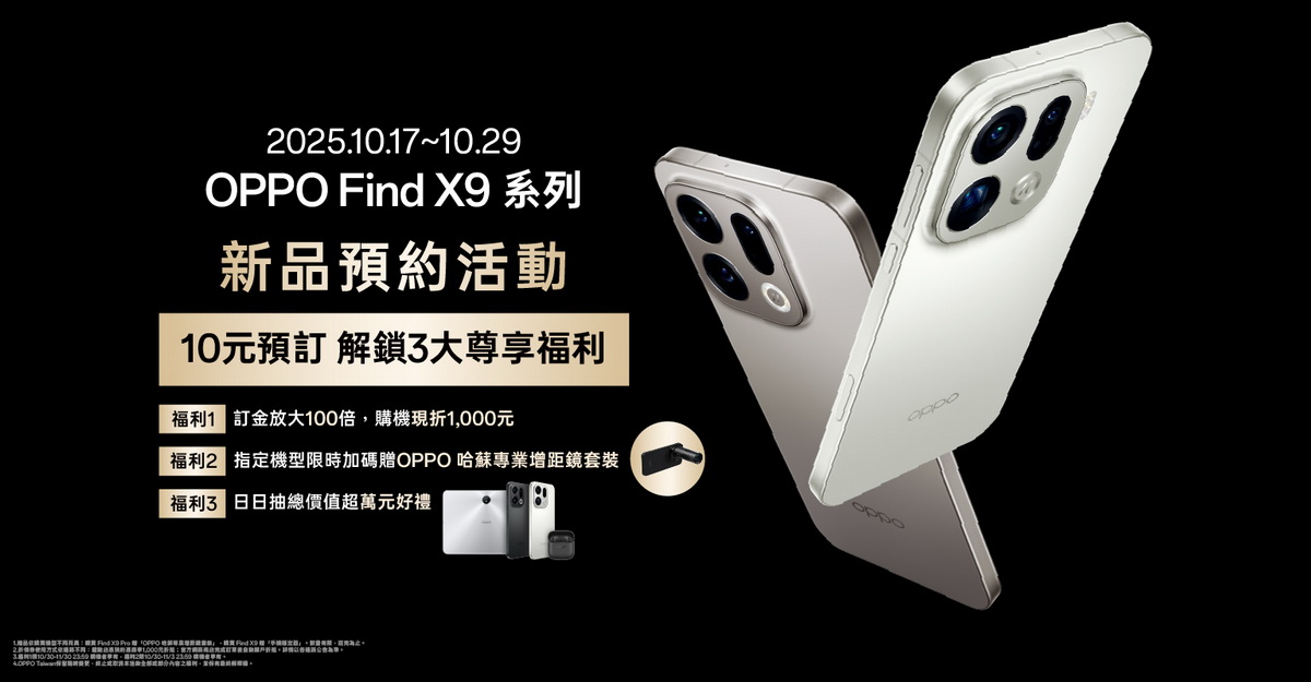 為回應廣大粉絲的喜愛,OPPO台灣於今(17)日宣布將快速引進,Find X9 系列10月30日將於台灣市場發表,並將限量推出OPPO 哈蘇專業增距鏡套裝;同時,於即日起至10月29日開啟Find X9 系列預約活動,於全台OPPO體驗店、OPPO網路商店以10元預訂即享以下三大好禮,並有機會獲得上市後採限時限量發售的OPPO 哈蘇專業增距鏡套裝。