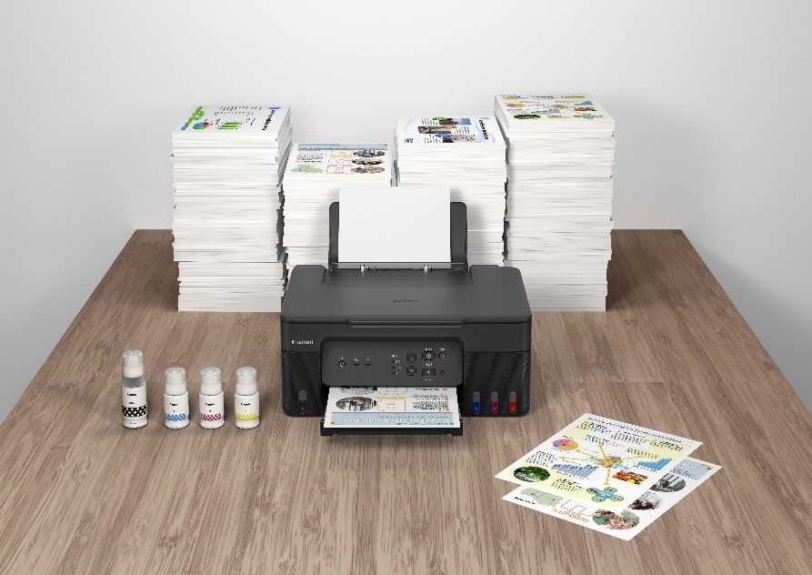 Canon G系列三款新機,是針對有採購預算限制的使用者,提供基本功能和輕量墨水瓶可選購,以滿足中印量的使用需求。同時,外箱內的緩衝包材由木纖維 ( 紙漿 ) 製成,使用後可回收利用,且焚燒時不會散發有毒物質。印表機本體的一部份採用可回收塑料,以減少對環境的影響。