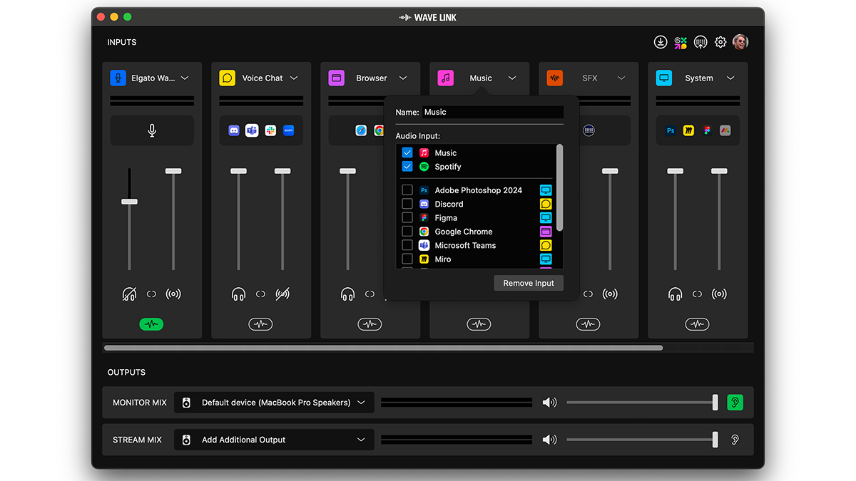 現在,Windows 用戶可以享受與 macOS 上相同的無縫音訊路由。只需單擊一下,即可將 Discord 或 Spotify 等應用程式新增至任何輸入通道。 Wave Link 自動捕獲您的應用程式音頻,無需調整 Windows 設定。另外,Wave Link 會記住您的設置,因此您無需在更新後重新配置。