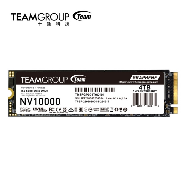 TEAMGROUP NV10000 M.2 PCIe 5.0 固態硬碟採用先進 3D NAND 快閃記憶體技術及最新 PCIe Gen5 x4 傳輸介面,讀取速度最高達 10,000 MB/s,提供 1TB、2TB 及 4TB 多種容量選擇,並相容 Intel 與 AMD 最新平台,桌機與筆電皆能靈活運用,兼顧大容量與耐用性。搭載十銓獨家專利石墨烯散熱標籤貼【1】,能有效降低 SSD 運行溫度並提升散熱效率,長時間使用依舊維持卓越效能表現。