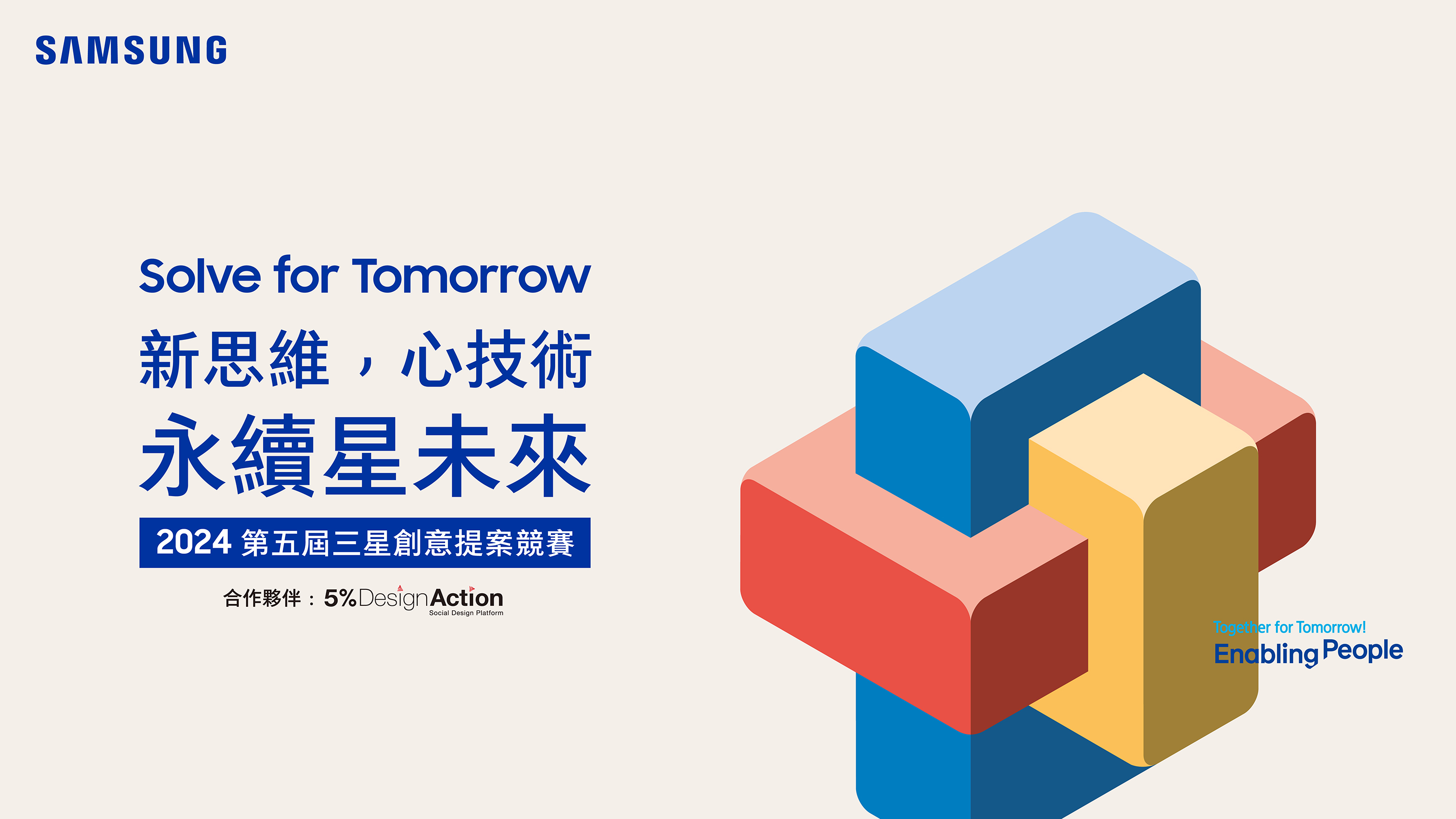 三星電子秉持「共創未來!賦能予人」的理念,持續於全球各地推出Solve for Tomorrow 競賽,鼓勵全球青年運用科技知識與創意,解決當地社會問題。台灣至今已邁入第五屆,累計近350個團隊、超過1,250名同學與教師參與,分享創新思維。今年三星Solve for Tomorrow 持續以「新思維,心技術,永續星未來」為主題,鼓勵全台公私立高中職及五專一至三年級在學學生(註一)創意提案,從自身生活觀察發想,以「永續社會」及「永續環境」為方向發展具潛力的特色解方。本次競賽除了呼應聯合國永續發展目標與三星「Everyday Sustainability 永續日常」企業方針,更結合今年三星在巴黎奧運提出的「Open Always Wins」開放創新精神。台灣三星今年首度邀請社會設計平台 5% Design Action 擔任正式合作夥伴,期望藉助其長期於社會創新的影響力,擴大資源串聯,並給予參賽同學們更多啟發,優化提案完整度。